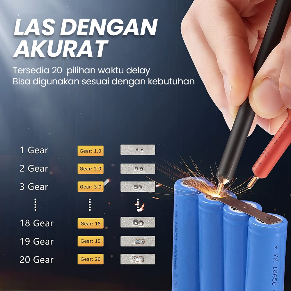 Las dengan Akurat Memiliki hingga 20 gear, membuat proses pengelasan akan semakin mudah dan akurat. Dilengkapi dengan spot welding pen, sangat cocok digunakan untuk kebutuhan rumah sehari-hari. Tersedia 20 pilihan waktu delay yang bisa Anda gunakan sesuai dengan kebutuhan. Dianjurkan untuk menggunakan strip nikel 0.1-0.15 mm