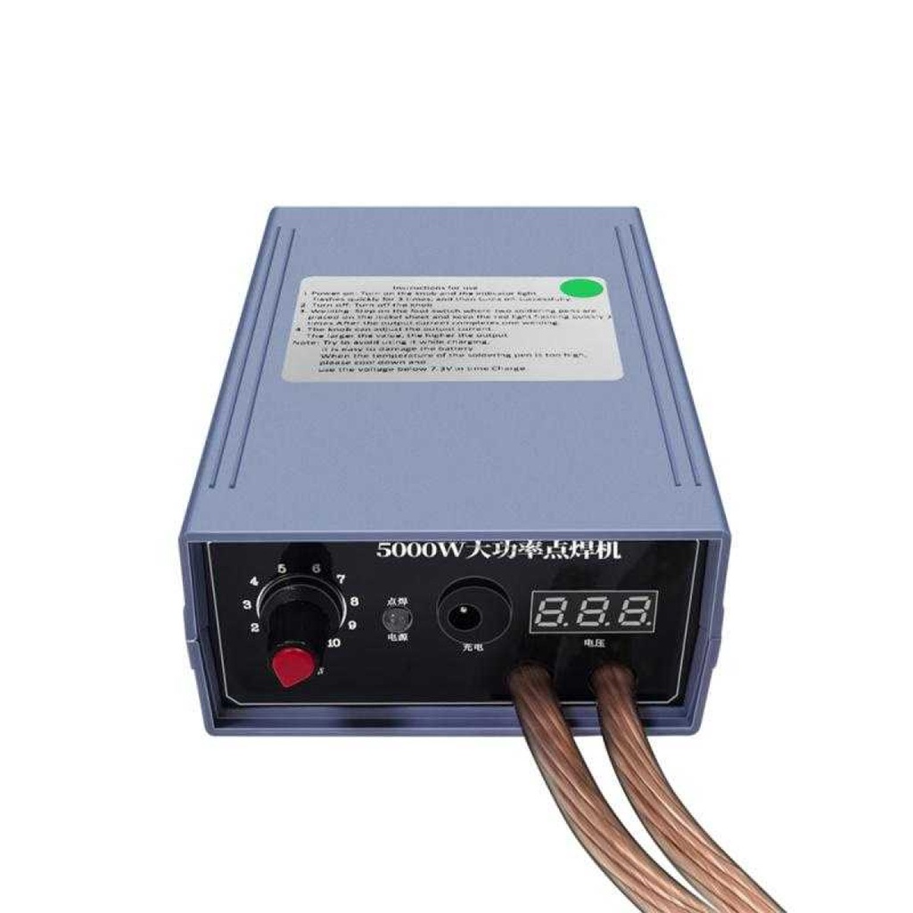 Spesifikasi Voltase Input: 8.4 V 500ma Output: 8 V Daya / Power Daya: 5000 W Arus: 1000 A Material ABS Shell Dimensi Mesin Las: 15 x 10 x 6 cm Switch Kaki: 8 x 8 x 3.5 cm Panjang Kabel: 44 cm Lain-lain Welding Thickness: 0.1-0.15 mm