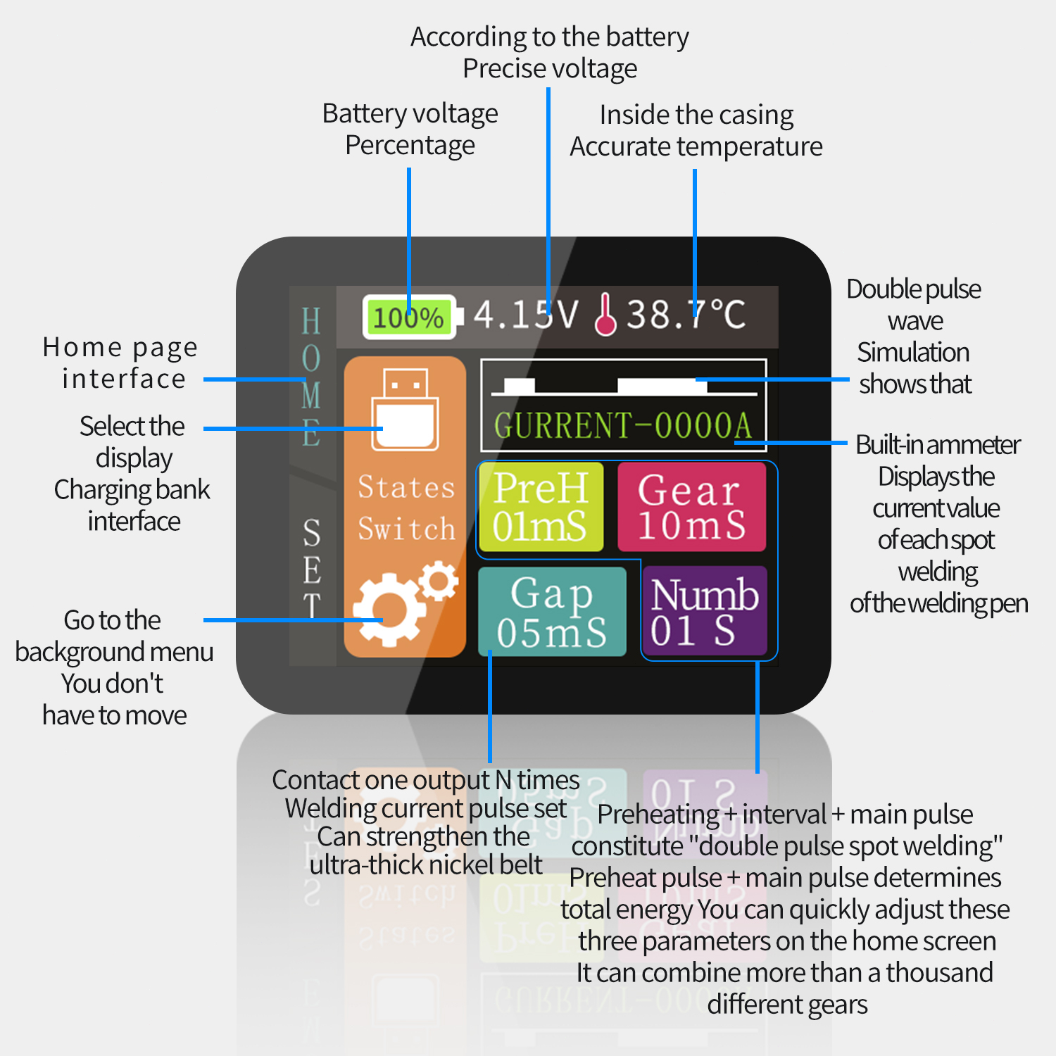 Detail Mesin Las Mini Spot 30 Gigi Layar Warna LCD 1.8 Inci untuk Baterai 18650 dan Bank Pengisi Daya Cepat