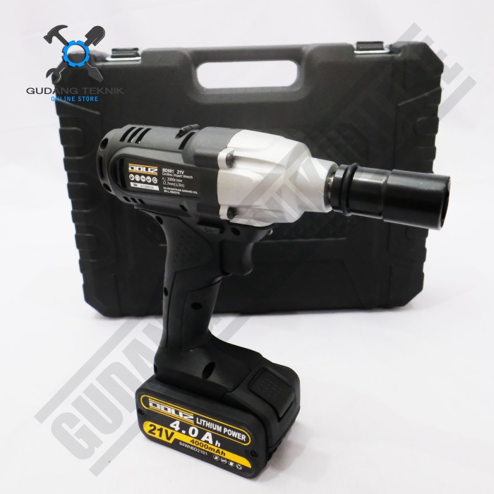 Merk : DOLIZ Tipe : BD501 Tegangan : 21V/ 4.0Ah Dudukan alat : 1/2" / 12,7mm dengan hog ring Kecepatan Tanpa Beban : 0-400 / 2000 rpm Dampak per Menit : 0 - 2500 bpm Torsi Maks : 200 Nm LED : 1 Baterai : Li-Ion. Waktu Pengisian Daya : 100 mnt. Berat termasuk baterai : 1,7kg
