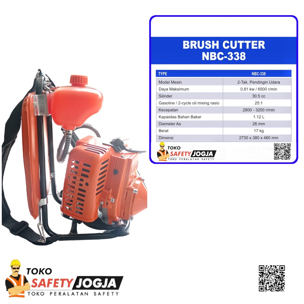 Spesifikasi Merek : NISHIKAWA Tipe : NBC 338 Model Mesin : 2 Tak, Silinder Tunggal, Pendingin Udara. Kapasitas : 30,5 cc Output Maks : 0,81 kw Karburator : Tipe Apung Sistem penyalaan : IC Ignition (solid state) Busi penyalaan : BM-7A atau Champion C16 Bahan Bakar : Bensin campur oli mesin 2 Tak Pencampuran Minyak : 25 : 1 Kapasitas Tangki Bahan Bakar : 1.2 Liter Drive : Flexible Shaft, Drive Shaft, Pinion, dan Gear. Arah perputaran pemotong : dilihat dari atas : counter-clockwise Dimensi : 35 x 28 x 40 cm (hanya bagian back-loaded) Berat : 9 KG Berat Volume : 18 KG