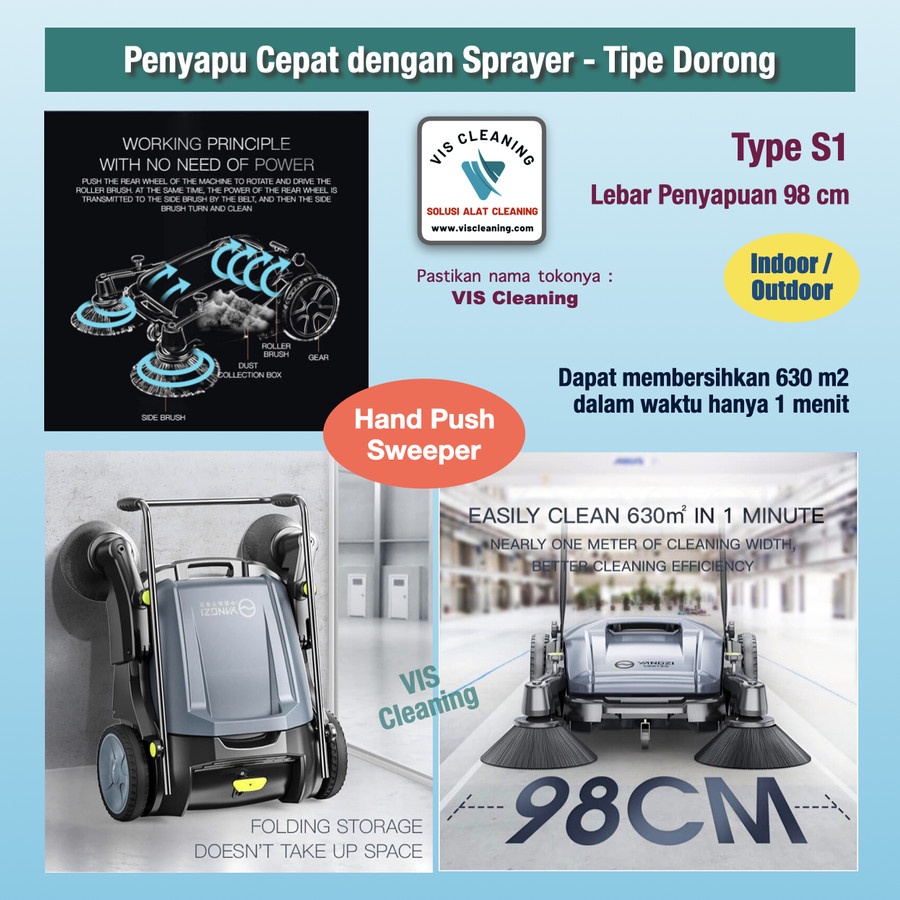 * Fungsi : Menyapu dengan cepat * Mudah digunakan, dengan didorong. Tanpa memerlukan listrik * Handle dapat dilipat, mudah dipindahkan * Sikat roll di sisi bawah + sikat putar di sisi samping * Posisi dan tekanan sikat dapat diatur sesuai permukaan lantai * Sikat putar di sisi samping bisa dilipat jika tidak diperlukan * Dilengkapi sprayer dengan tenaga battery utk mengurangi debu. * Bak penampungan dapat mudah dilepas utk mengosongkan sampah