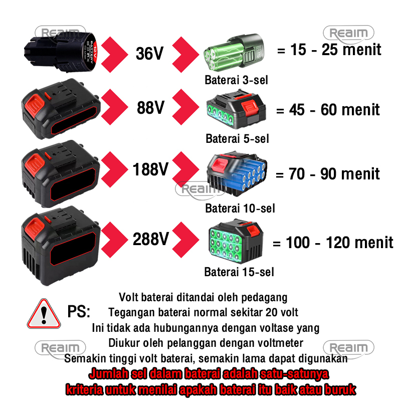 Masa pakai baterai yang diharapkan: 🔋Baterai 36V 5000mAh = 20 - 30 menit. 🔋Baterai 88V 10000mAh = 45 - 60 menit. 🔋Baterai 188V 15000mAh = 75 - 90 menit. 🔋Baterai 288V 20000mAh = 100 - 120 menit. Durasi bervariasi sesuai dengan metode penggunaan.