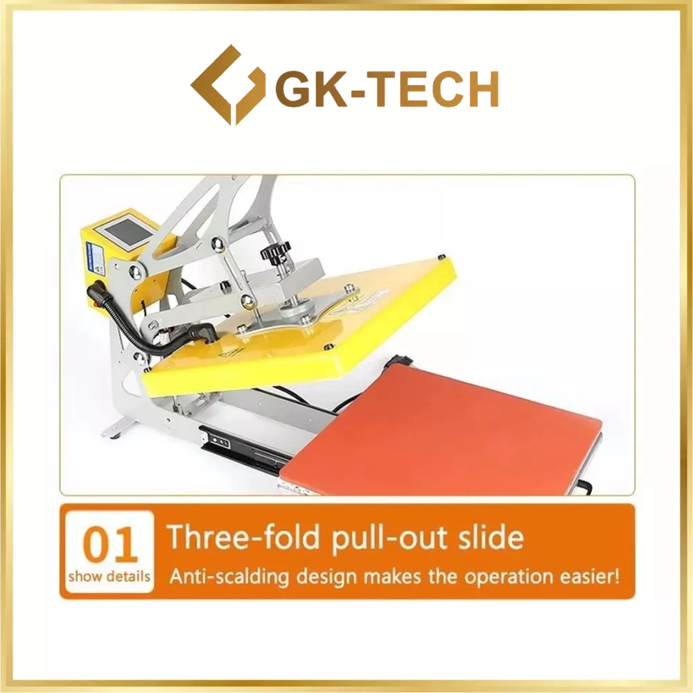 Spesifikasi mesin: * Fitur Terbaru : Auto Open ( Pemanas mesin akan otomatis terbuka ketika proses Press selesai ) * LCD Touch Screen yg Keren * Automatic Timer * Meja Sliding : Meja bisa ditarik maju untuk mempermudah pemasangan bahan * Kaki mesin berupa suction, mesin menempel di meja dan tidak mudah bergeser * Dilengkapi dengan Flexible Adjustment Heating Plate Technology, merupakan teknologi untuk mengatur secara otomatis heating plate agar lebih menyesuaikan tekanan pada media yang kurang rata. * Working Size : 38 x 38 cm ( Free Teflon Sheet 38 x 38 cm ) * Power 900 Watt. Hemat daya, cocok untuk penggunaan listrik rumahan minimal 1300 watt * Pemanas Menggunakan bahan Aluminium Heating Plate Yg Tebal dengan 6 Rod/jalur pemanas, sehingga panas lebih merata & stabil, Tidak mudah rusak/putus * Temperature range: 0-250°C * Time Range : 0-999 sec * Garansi 1 tahun (servis + sparepart)