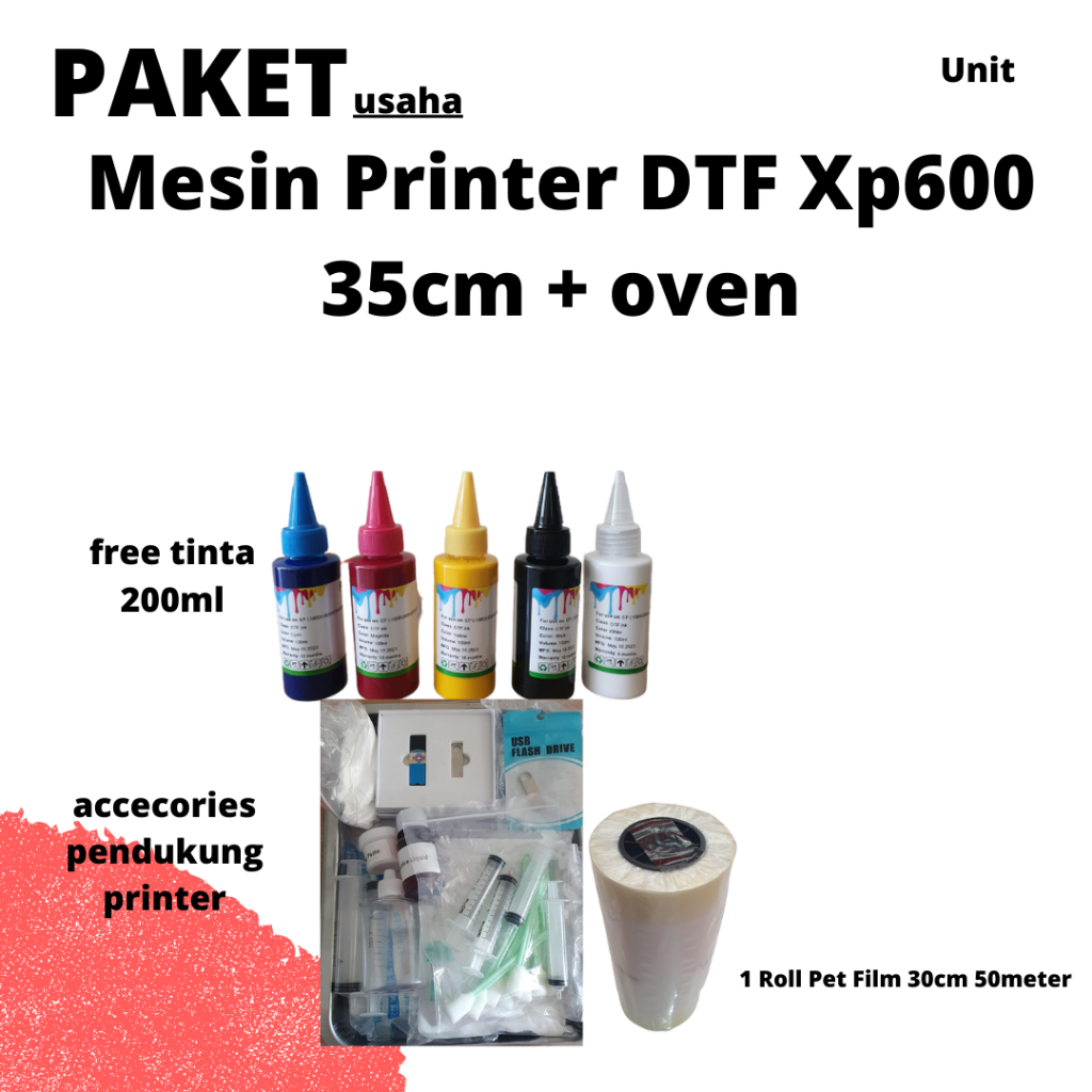 BONUS!!!! 1 Roll Pet Film 30cm 50meter , Tinta CMYKW @200ml, 250 gram powder hotmelt, accecories pendukung printer