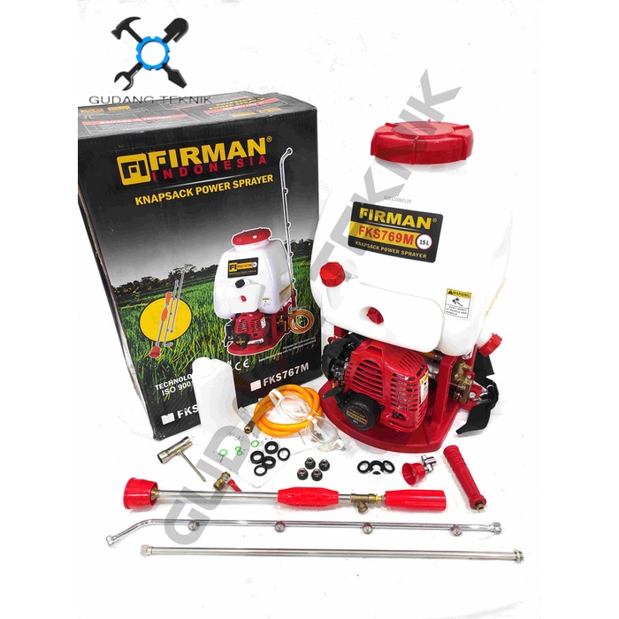 Merk : FIRMAN Tipe : FKS769 Kapasitas Semprot 8 L/menit Tekanan Semprot 10 - 30 Debit Keluaran (L/menit) 1.2 L at 10 Bar Standart Nozzle 1.7 L at 20 Bar Tipe Mesin Silinder Tunggal 2 Tak Berpendingin Udara Kapasitas Silinder 26 cc Daya Maksimum 0.75 kW/1 HP Kapasitas Bahan Bakar 0.5 L Kapasitas Cairan Kimia 15 L Sistem Penyalaan Recoil Starter