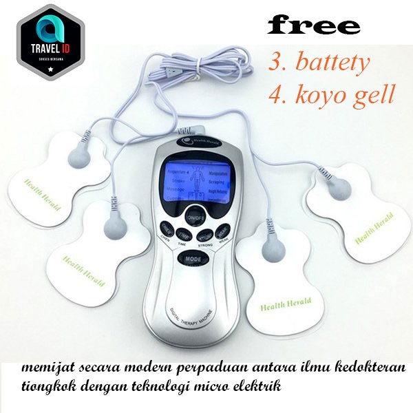 Kelebihan lain alat ini dibanding produk sejenisnya adalah: 1. SUDAH TERMASUK 2 HEALTHY GEL PADS & KABEL DENGAN 4 MATA 2. KUALITAS LEBIH BAIK DIBANDING ALAT SEJENIS DENGAN MERK LAIN 3. BISA MENGGUNAKAN ADAPTOR SEBAGAI PENGGANTI BATTERE 4. DETAIL & PEMBUATAN LEBIH RAPI (GRADE A ) 5. ADA LAYAR DISPLAY YANG MEMUDAHKAN PENGATURAN / PEMANTAUAN KERJA & FUNGSI ALAT