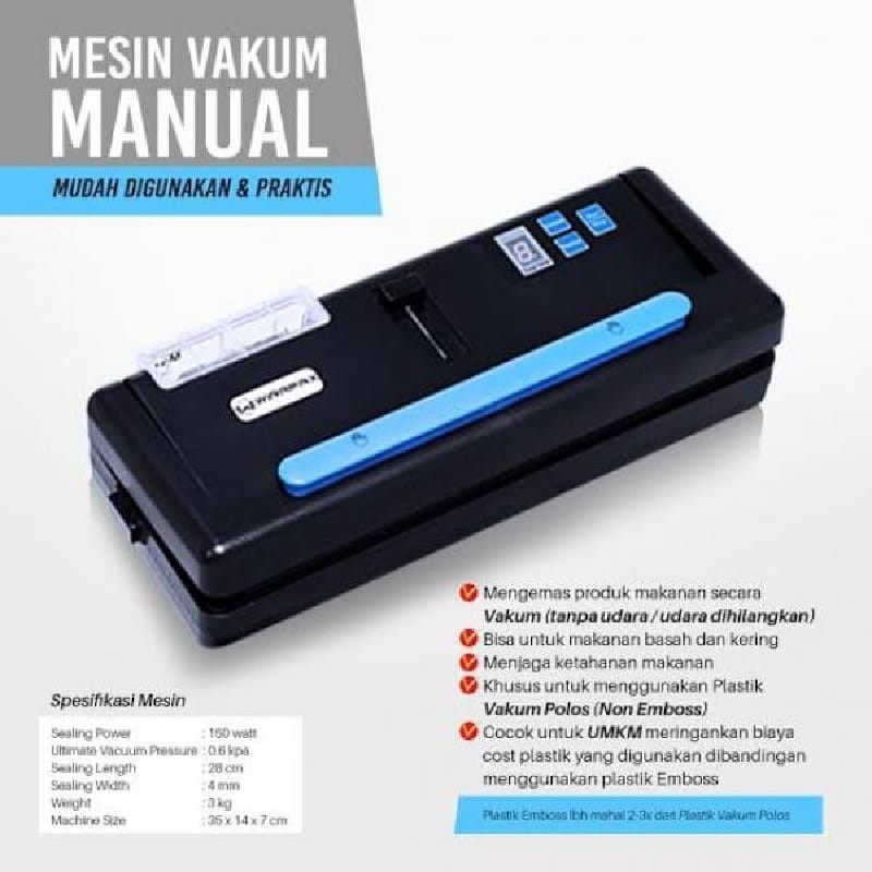 Spesifikasi : Jenis Barang : Mesin Hampa Udara / Vacuum Sealer Brand : Matrix by Hualian Type : DZ-280X Voltase : 220V / 50Hz Power : 150 Watt Tekanan Vacuum : 0.6 kpa Panjang Sealing : 28 cm Tebal Seal : 5 mm Vacuum & Sealing Time : 6-12 Detik Mesin Size ( P x L x T ) : 350 × 140 × 70 mm