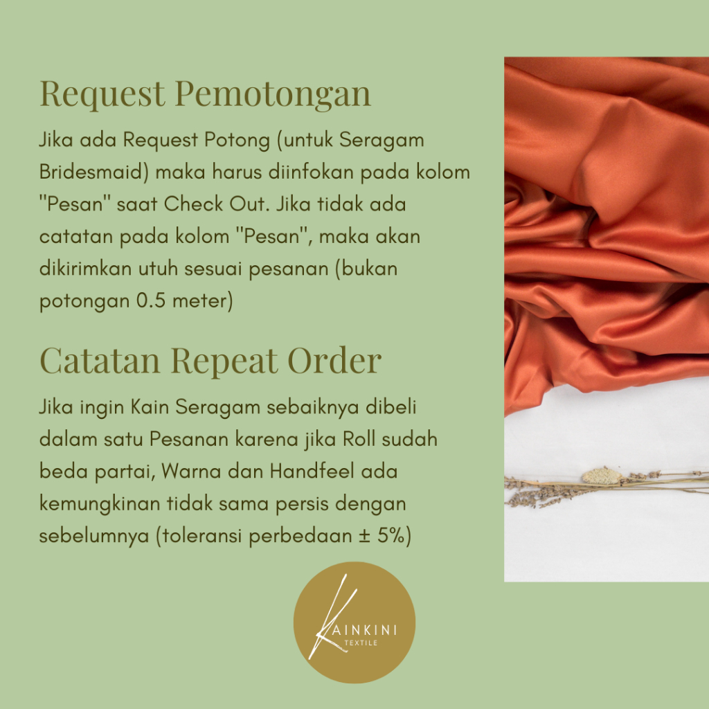 Oleh karena itu, Kain Seragam/Bridesmaid disarankan dibeli dalam 1 Pesanan untuk memastikan Kain Seragam dipotong dari Roll/ Partai yang sama. Toko tidak menjamin Warna/ Handfeel 100% sama untuk Pesanan beda waktu.