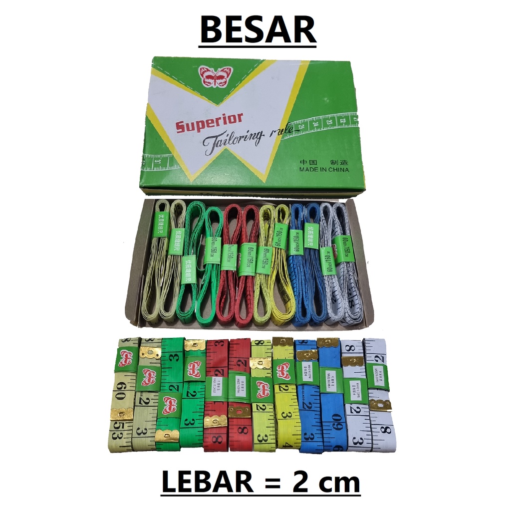 METERAN KAIN / BAJU / BADAN Tersedia size kecil (lebar 1,2 cm) dan size besar (lebar 2 cm) Merk : Butterfly Bahan Plastik, kualitas bagus, ada lubang besi di ujung Panjang : 150 cm / 60 inch WARNA RANDOM, TIDAK BISA PILIH