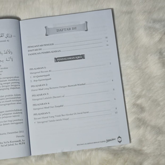 Buku ini untuk kelas Tajwid yang kami cetak ini merupakan buku pertama dari trilogi buku panduan membaca Al-Quran yang diterbitkan. Kami menyarankan agar buku ini dipelajari bersama guru pembimbing demi terhindar dari kesalahan dan kekeliruan dalam penerapannya. Harapan kami, semoga buku ini bermanfaat dan dapat mendorong kaum Muslimin untuk mau belajar, sehingga mampu membaca Al-Quran dengan baik dan benar sesuai yang dicontohkan oleh Rasulullah SAW dan menjadi sebaik-baikk umat Islam, Aamiin. Sebagaimana yang disabdakan oleh Nabi SAW : "Sebaik-baik orang diantara kalian adalah yang mempelajari Al-Quran dan mengajarkannya." (HR.Al-Bukhari)