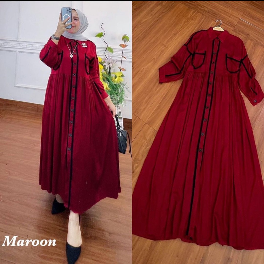 New Dress โจ Dress viral ! Jgn dilamain sih ini bunda . Modelnya lucu bgt kan. Kualitas bahannya jgn diragukan ! Ada 9 varian warna cantik langsung co skrg jg ๐ . Mettha Dress Colour : black, toska, mustard,navy,purple, maroon, white, dusty, taro . *full kancing hidup * saku hidup *lengan kancing . Material : Rayon twill Size : All size fit XL ( bisa sampai BB 75 ) Lingkar dada : 110cm Panjang : 125cm Panjang tangan : 55cm Berat baju : 0.455 kg . Read Caption Sebelum Order ๐