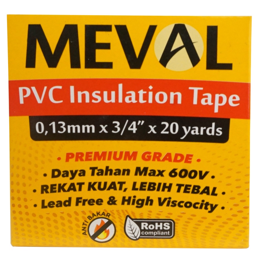 Meval PVC Insulation Tape merupakan PREMIUM GRADE yang memiliki daya rekat max 600V, kekuatan lakban dan ukuran semua terjamin oleh MEVAL sebagai produsen resmi terbesar di Indonesia.