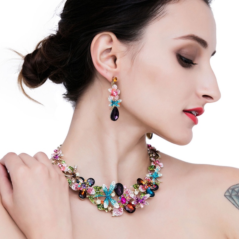 Detail Mewah Multi Warna-Warni Kristal Capung Bridal Perhiasan Set Kalung Anting Wanita Pesta Berlian Imitasi Hadiah Pernikahan Aksesoris