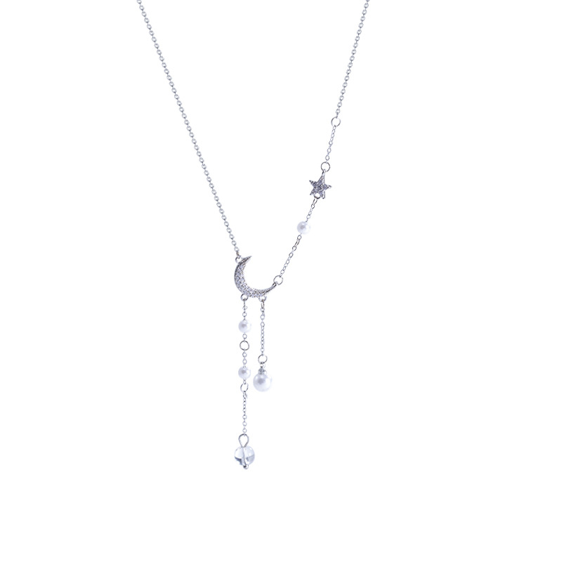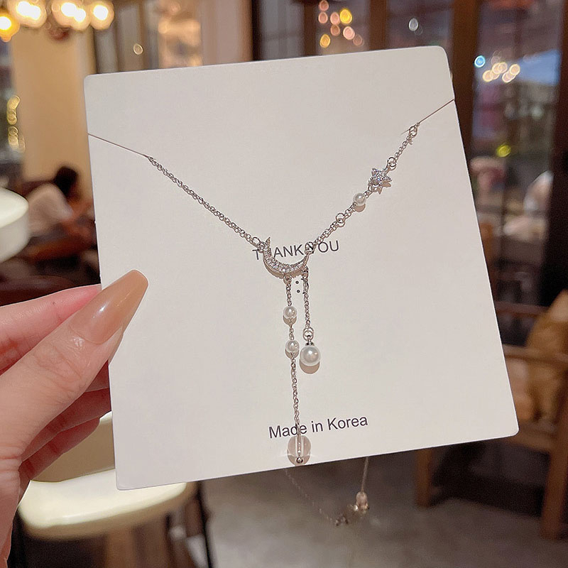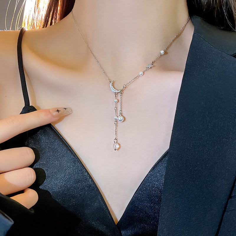 Detail Mewah Panjang Rumbai Bintang Bulan Liontin Kalung Titanium Wanita Indah Zirkon Choker Necklace