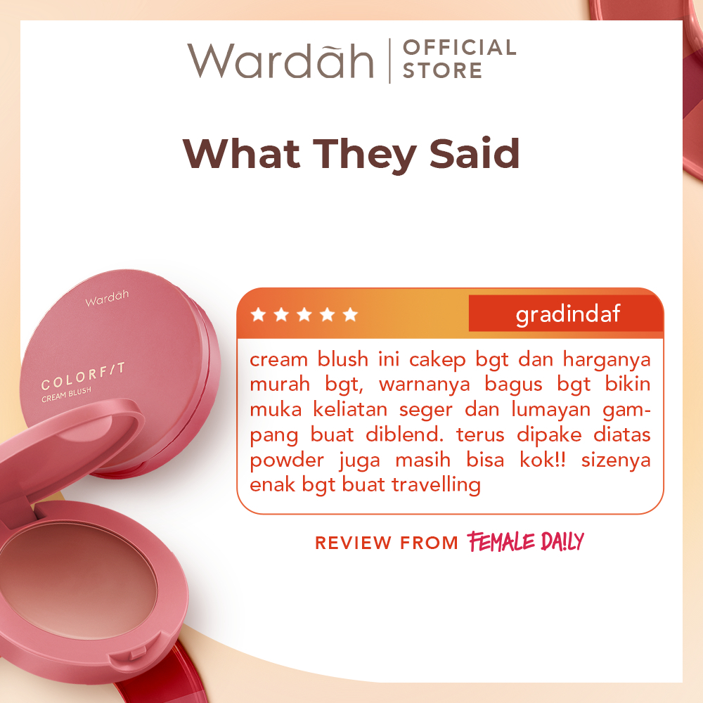 How to Use: 1. Dapat digunakan setelah memakai Colorfit Foundation, bedak (Colorfit Powder Foundation), dan Colorfit Cushion. 2. Ambil blush menggunakan jari kemudian tap-tap dan ratakan blush pada pipi. 3. Colorfit Cream Blush dapat digunakan beberapa layer untuk mendapatkan intensitas warna yang diinginkan.