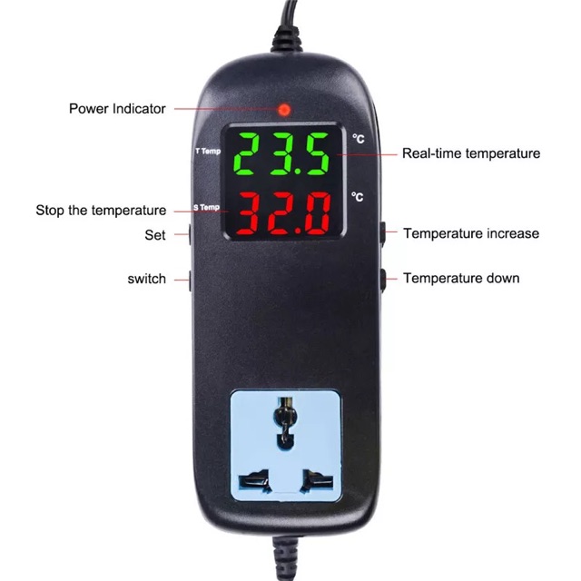 Features: A useful temperature controller for controlling temperature intelligently. With large and clear LED dual display for better readability. Wide temperature measuring range -40~120℃(-40~248℉). Cooling and heating control, equipped with power supply cord. Delay protection function. Support brown-out storage(Set parameters is still valid after short circuit). Can be used for vegetable greenhouse, domestic water tanks, aquarium, aquaculture and other temperature-controlled systems to control temperature. Item Type: Temperature Controller Color: Black Material: PC Plug: US plug; EU plug Temperature control range: -40°C~120°C Temperature measurement error: ±0.5°C Sensor model: NTC (10K/3435) Display accuracy of 0.1 degrees. Control accuracy: 0.1 °C Working voltage: AC85V-AC250V Working current: MAX200mA Relay contact current: AC10A/220V, can withstand 2200W load Data saving: Yes Working temperature: 0 ° C ~ 60 ° C Storage temperature: -10 ° C ~ 60 ° C Meter size: 6*3*15. 5mm/0.24*0.12*0.61inch (L*W*D) Opening size: 4* 3. 5mm/0.16*0.14inch(L*H) Item Size: 15.5 * 6 * 3cm / 6.1 * 2.4 * 1.18inch