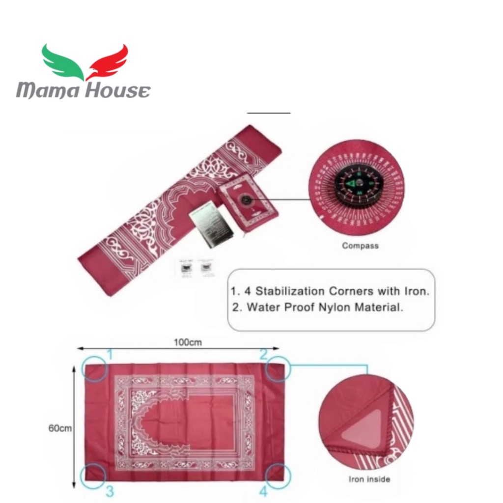 SAJADAH TRAVEL/ WATERPROFF : Pocket Prayer Mat / Sajadah + Kompas Bahan: Parasut, 100% Polyester anti air Size kantong : +/- 14 x 9 cm Size sajadah:+/- 100 x 60 cm
