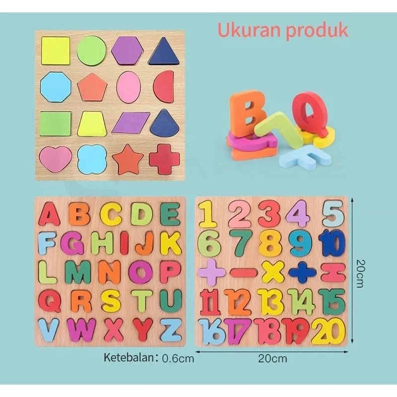 Product Features: ⭐ Pengenalan huruf, angka, dan bentuk. ⭐ Melatih kognitif, koordinasi mata dan tangan, serta motorik halus anak untuk menggenggam. ⭐ Dibuat menggunakan kayu berkualitas baik sehingga tidak mudah rusak. ⭐ Bagian pinggiran alas dibuat bulat sehingga aman untuk balita anda. ⭐ Menggunakan cat berbahan dasar air, sehingga tidak berbau dan tidak membuat iritasi. ⭐ Potongan puzzle diasah manual, menghasilkan pinggiran yang halus dan tidak bergerigi.