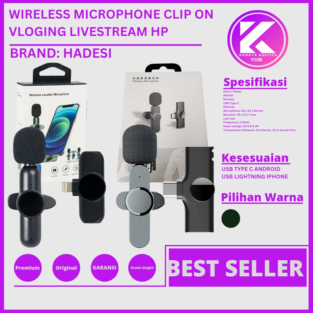Elektronik > Perangkat Audio & Speaker > Mikrofon & Aksesoris > Mic Vlog Youtuber Live Streaming HADESI Mikrofon Portable Wireless Lavalier Mic Microphone Clip On Wireless USB Type-C USB LIGHTNING - HA80 HA85