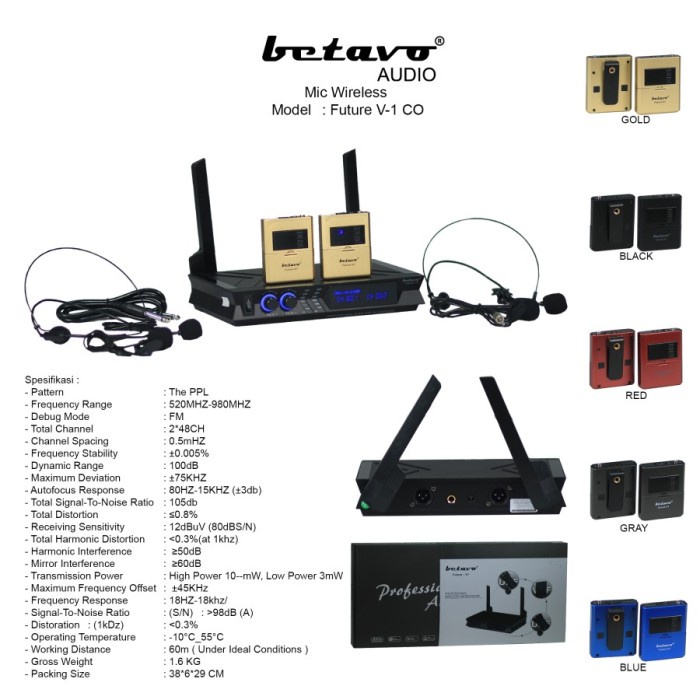 Spesifikasi : - Pattern : The PPL - Frequency Range : 520MHZ-980MHZ - Debug Mode : FM - Total Channel : 2*48CH - Frequency Stability : ±0.005% - Dynamic Range : 100dB - Maximum Deviation : ±75KHZ - Autofocus Response : 80HZ-15KHZ (±3dB) - Total Signal-To-Noise Ratio : 105db - Total Distortion : ≤0.8% - Receiving Sensitivity : 12dBuV (80dBS/N) - Total Harmonic Distortion : <0.3%(at 1khz) - Harmonic Interference : ≥50dB - Mirror Interference : ≥60dB - Transmission Power : High Power 10--mW, Low Power 3mW - Maximum Frequency Offset : ±45KHz - Frequency Response : 18HZ-18khz/ - Signal-To-Noise Ratio : (S/N) : >98dB (A) - Distoration : (1kDz) : <0.3% - Operating Temperature : -10°C_55°C - Working Distance : 60m ( Under Ideal Conditions ) - Gross Weight : 1.6 KG - Packing Size : 38*6*29 CM