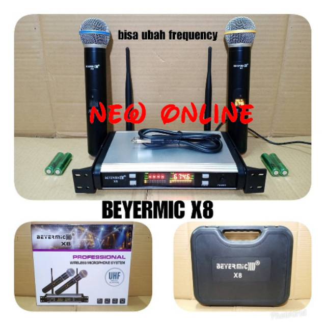 Mic Wireless BEYERMIC X8 deskripsi *1 unit receiver mic *2 mic digital display *UHF freq bisa di ubah *1 unit kabel Akai *1 unit hardcase