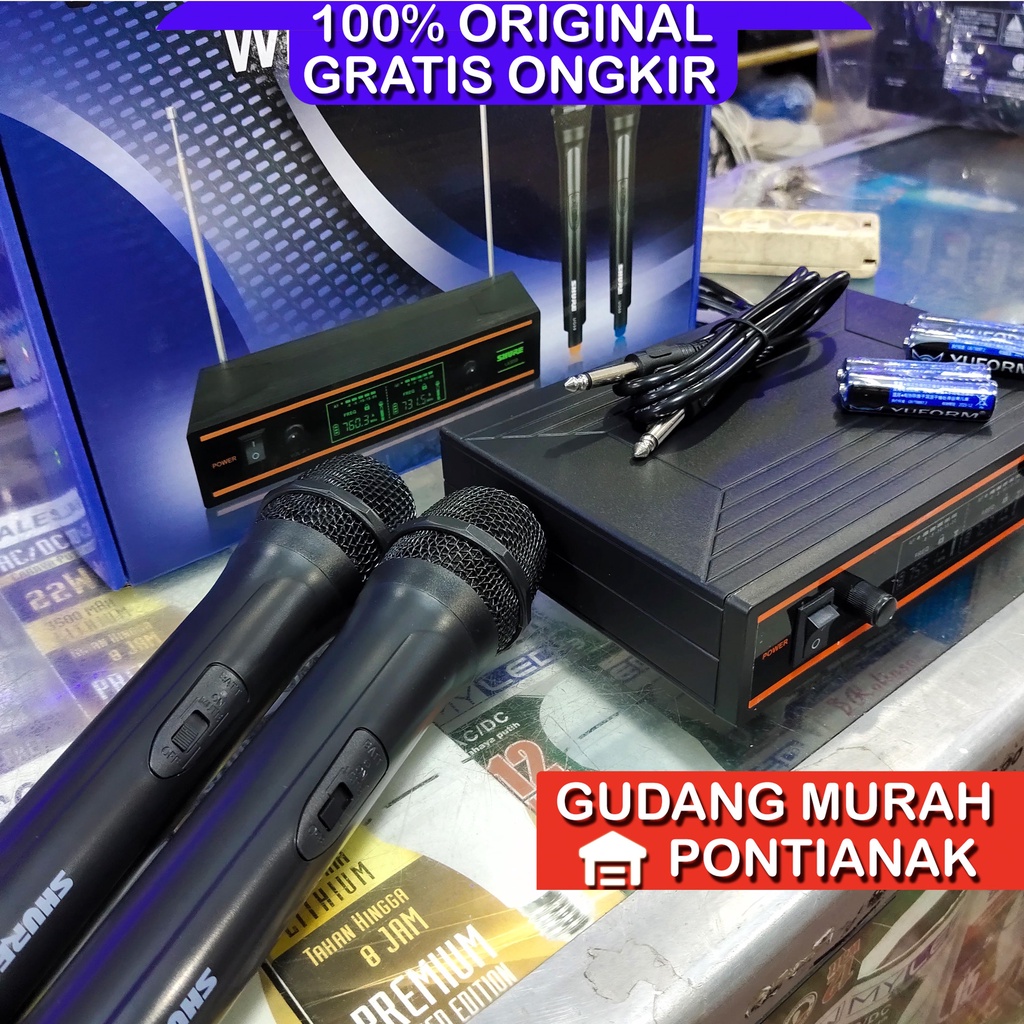1bh resiever 2bh mic pegang 1bh kabel audio output Free baterai AA Frequency UHF jarak bisa pakai sampe 40m suara bagus, jernih dan bersih, empuk cocok buat karaoke, MC, pidato dan laen2