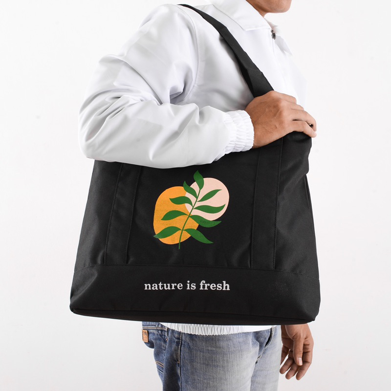 _ Totebag NATURE _ Materials : - Bahan Luar : Polyester cordura - Bahan Dalam : Satin Torin - Sablon : Rubber Premium - Kewkew Besi - Ring Jalan Besi Fitur : - Bisa Di Totebag - Bisa Di Selempang - Dapat Tali Selempang - Terdapat 1 skat Laptop - Muat Laptop 14 inch maxsimal - Tutup Kompartemen dengan resleting Ukuran : Tinggi 36 cm X Lebar 45 cm X Tebal 13 cm