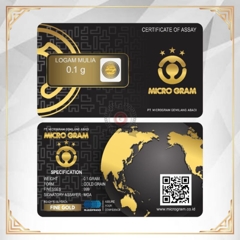 MicroGram merupakan emas 24 karat bersertifikat resmi & telah di uji di Lab Sucofindo. MicroGram terdiri dari berbagai macam ukuran mulai dari 0.001 gr, 0.002 gr, 0.005 gr, 0.01 gr, 0.02 gr, 0.05 gr dan 0.1 gr.