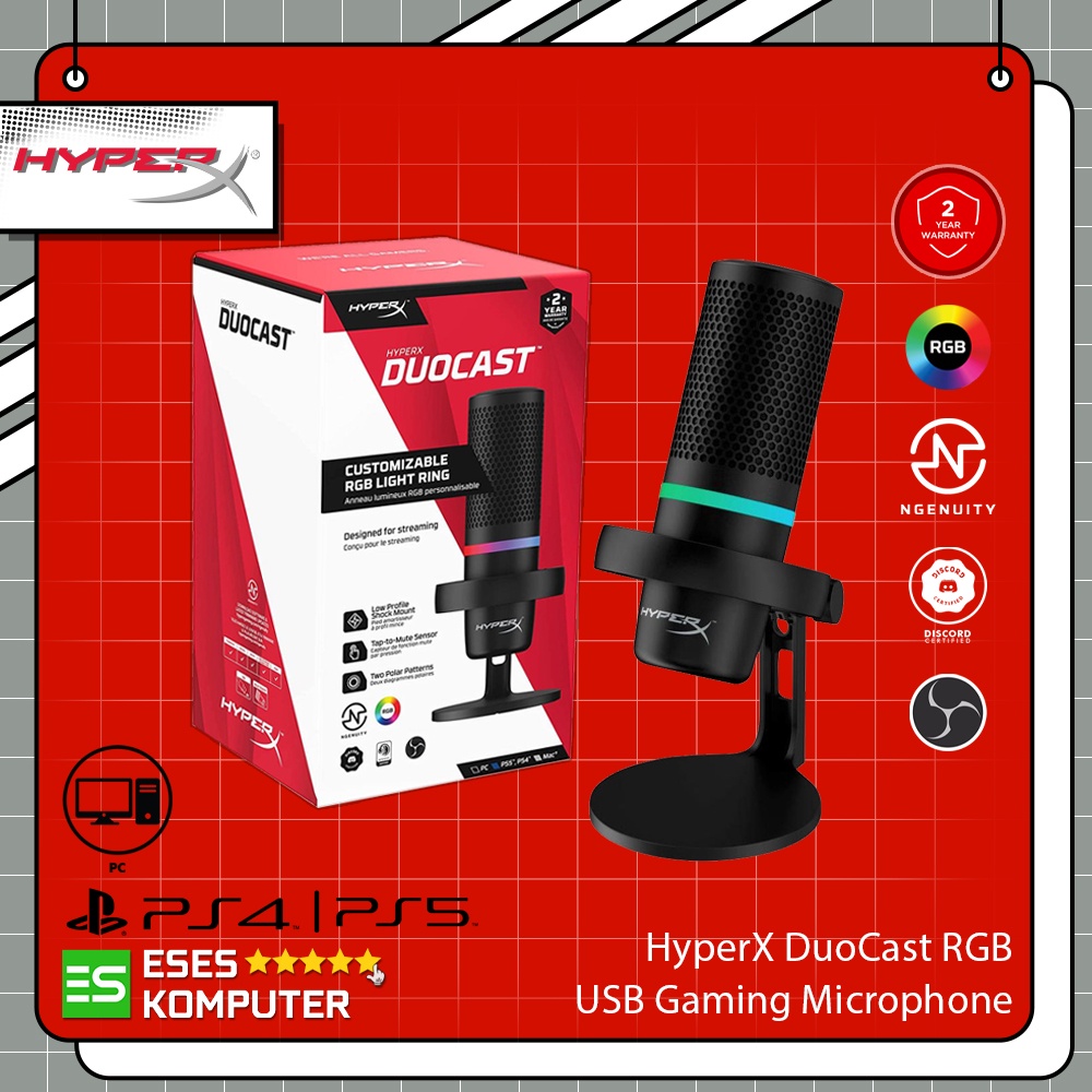 Spesifikasi : USB microphone with standout style and sound. Featuring an elegant design, a low-profile shock mount, and a tasteful RGB light ring, the HyperX DuoCast is a full-featured USB microphone that’s built for gaming, working, and content creation.