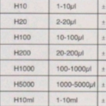 H2 = 0.1-2.5 ul H10 = 1-10 ul H20 = 2-20 ul H100 = 10-200 ul H200 = 20-100 ul H1000 = 100-1000 ul H5000 = 1000-5000 ul H10ml = 1-10 ml