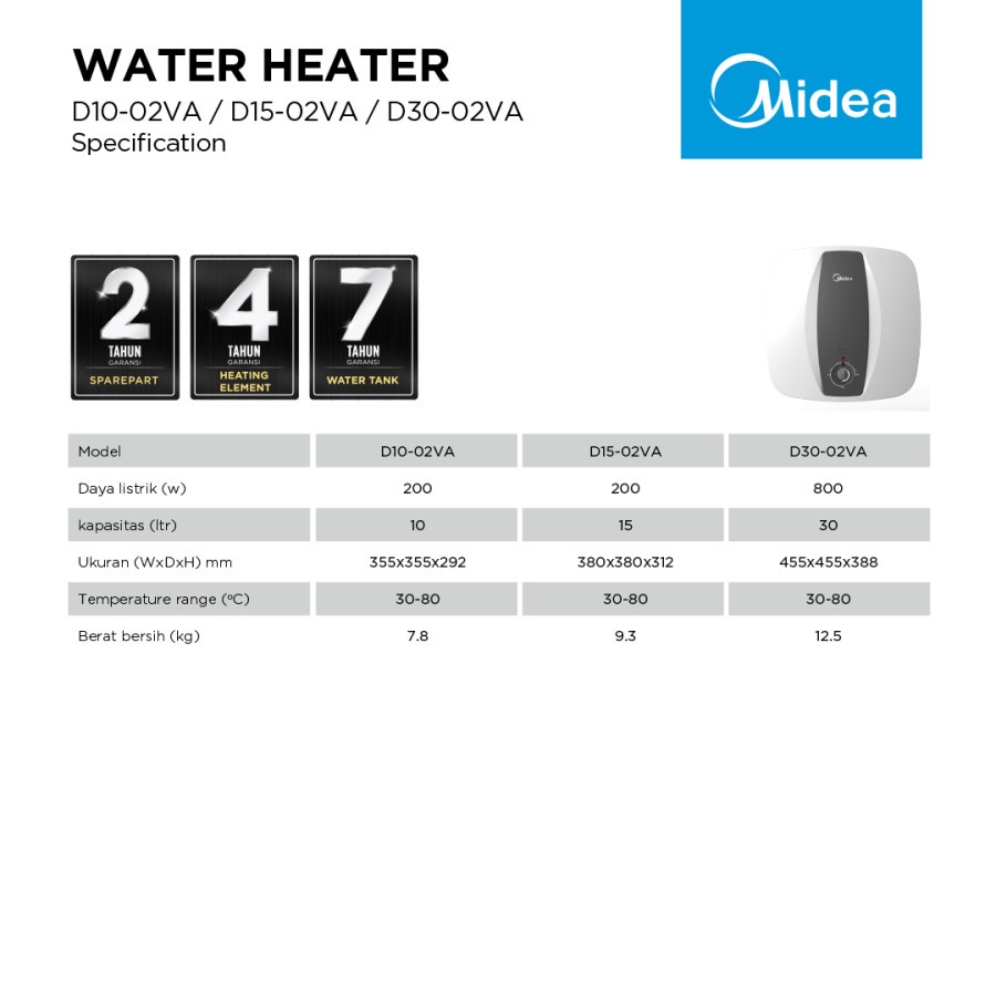 Detail MIDEA D30-02VA Water Heater 30 Liter Pemanas Air Listrik - VA Series - D10