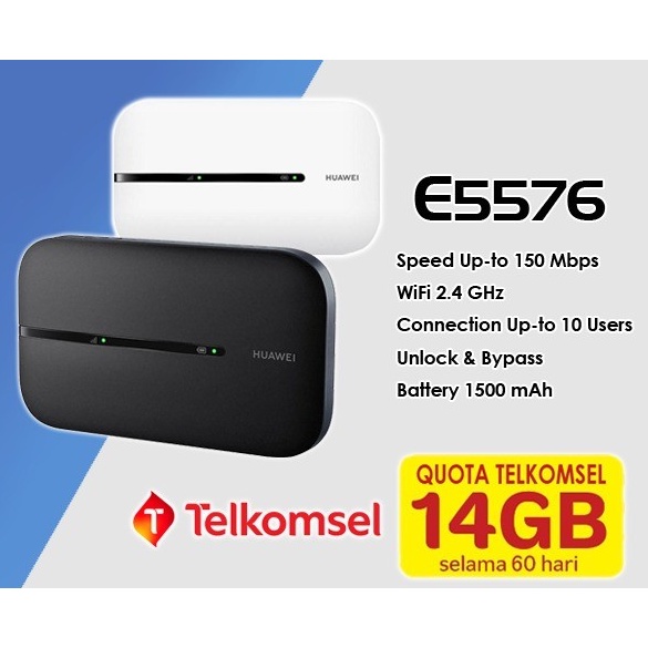 Spesifikasi: Huawei Type : LTE Mobile Wifi E5576-606 4G LTE Band 1/3/5/8/40 3G Band Band 1/8 Speed : LTE CAT 4 DL : 150 Mbps | UL : 50 Mbps Sharing : Up to 16 Devices Wifi Range : 10 Meter Battery : 6 hours usage, 300 hours standby, Capacity 1500 mAH Wifi Client via USB Cable Application : Hi Link Smart App Wireless Standard : 802.11 b/g/n Supported OS : Supporting Windows, MAC, Android, IOS