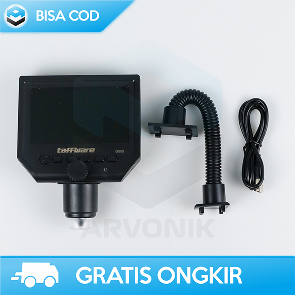 1 x Taffware Mikroskop Digital 3.6MP 600X dengan Monitor & Fleksibel Stand - G600 1 x Adaptor 1 x Kabel Charger Mini USB 1 x Penyangga 1 x Panduan Penggunaan Spesifikasi Pembesaran / Magnification 600X Material Plastik ABS Dimensi Bodi Display: 12 x 10.5 x 5 cm Bodi Kamera & Lampu: Diameter 3.5 cm, Panjang 4.5 cm Display: 9.5 x 5.5 cm Tinggi Leher: 12 cm Alas: 10 x 14.5 x 1.2 cm Lain-lain Tegangan Input: 110-240 V Piksel: HD 3.6 MP CCD Tampilan: Layar LCD HD 4.3 inci Pembesaran: sistem perbesaran terus menerus 1-600X Jarak objek: 15 mm-infinity (tergantung pada jarak yang berbeda) Jumlah Lampu LED: 8 pcs Baterai: Baterai lithium 605080 bawaan 3.7 V, 2500 mA Baterai Bekerja Terus Menerus: sekitar 6 jam Waktu Pengisian Daya: sekitar 4 jam Bahasa: Inggris, Spanyol, Rusia, Korea, Jepang, Thailand, Ibrani, Portugis, Jerman, Prancis, Italia, Turki, Ceko, Polandia, Cina Tradisional, dan Cina Sederhana (16 bahasa) Resolusi: 1080 P, 720 P, VGA Tag Tanggal: ditampilkan /tidak ditampilkan Deteksi Gerakan: ON/OFF (Saat aktif, akan mulai merekam video secara otomatis, segera setelah mendeteksi sesuatu yang bergerak.) Cyclic Record: mati / 3 menit / 5 menit / 10 menit (Jika kartu memori penuh, video pertama akan terhapus dan menyimpan video baru secara otomatis.) Nilai Eksposur: +2.0 (0) -2.0 Format: Ya/TIDAK Mati Otomatis: mati, 1 menit, 3 menit, Otomatis Matikan LCD: mati, 1,3,5 menit Reset Pabrik: Ya/Tidak Frekuensi Sumber Cahaya: 50 HZ, 60 HZ Pengaturan Waktu: tahun, bulan, hari, jam, menit, detik Rotasi Gambar: hidup/mati Cahaya: hidup/mati Versi Perangkat Lunak: V1.10