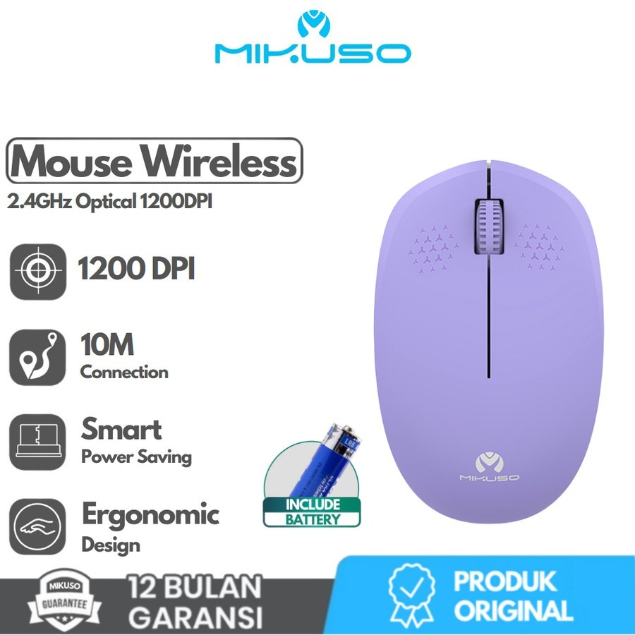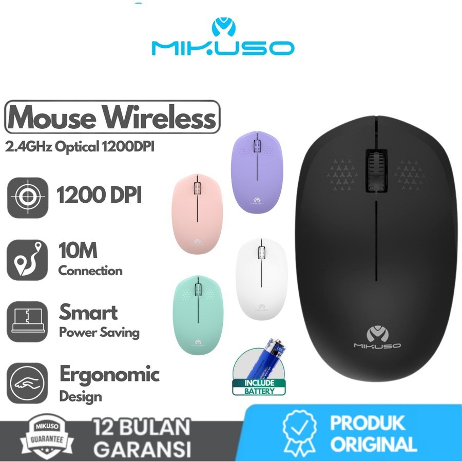 Spesifikasi: Brand : Mikuso Item Code : MOS-W080 Produk Name : Wireless Mouse 2.4Ghz Computer Mouse Mouse Type: 2.4Ghz Wireless Mouse Interface Type : USB Material: ABS Plastic Color : White , Black , Purple , Pink, Green Package : Color box Buttons : 3 Buttons + 1 Wheel Resolution : 1200DPI Working Distance : Up to 10 meters Battery Required : 1pc 1.5v AA Design: : Ergonomic Shape Certificate : CE FCC RoHS Single package size: 20X14X8.5 cm Compatible with : Windows XP/Vista/Windows 7/8/10 and Mac os