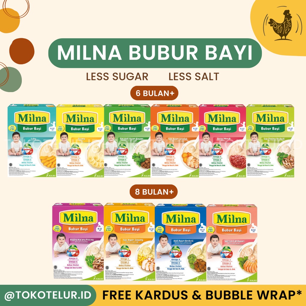 Milna Bubur Bayi merupakan MPASI bernutrisi lengkap dengan komposisi gizi seimbang untuk mendukung tumbuh kembang optimal Si Kecil. Dengan formula MILGROW (Milna Growth and Development) mendukung 3 perkembangan ABC: • Aktif (Motorik), membantu Si Kecil mengunyah, menggenggam, dan belajar makan sendiri. • Berkembang (Fisik), membantu perkembangan fisik Si Kecil anti-stunting dan anti-wasting, dengan tinggi zat besi dan zink. • Cerdas (Otak), membantu perkembangan otak Si Kecil dengan kolin, tinggi zat besi, serta DHA.