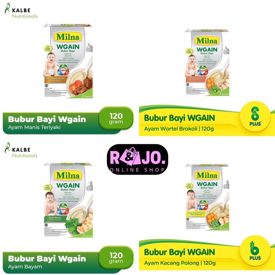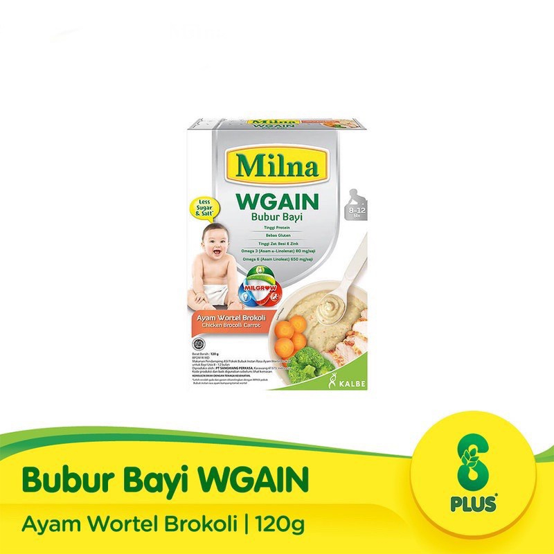 Keunggulan: 1. Kombinasi Protein ayam dan Whey berkualitas tinggi serta Coconut oil yang mudah diserap dan dicerna tubuh : Untuk membantu menambah berat bayi 2. Coconut Oil (minyak kelapa) yang mengandung lemak MCT : yang mudah dicerna dan diserap tubuh. 3. Tinggi Protein berasal dari protein ayam merupakan komponen esensial (penting) dalam pertumbuhan dan perkembangan anak. Perlu diketahui : Telah dilakukan uji mutu protein dengan membandingkan kualitas daya cerna dan daya serap protein antara beberapa jenis bubur, dimana hasil menunjukkan bahwa kualitas protein pada Milna Bubur WGAIN secara signifikan lebih baik dibandingkan protein pada beberapa jenis bubur bayi lainnya. 4. Omega 3 dan 6 : Untuk mendukung perkembangan otak bayi. 5. 15 Vitamin dan 8 Mineral : Untuk mendukung proses tumbuh kembang optimal bayi. 6. Tanpa bahan pengawet dan pewarna.