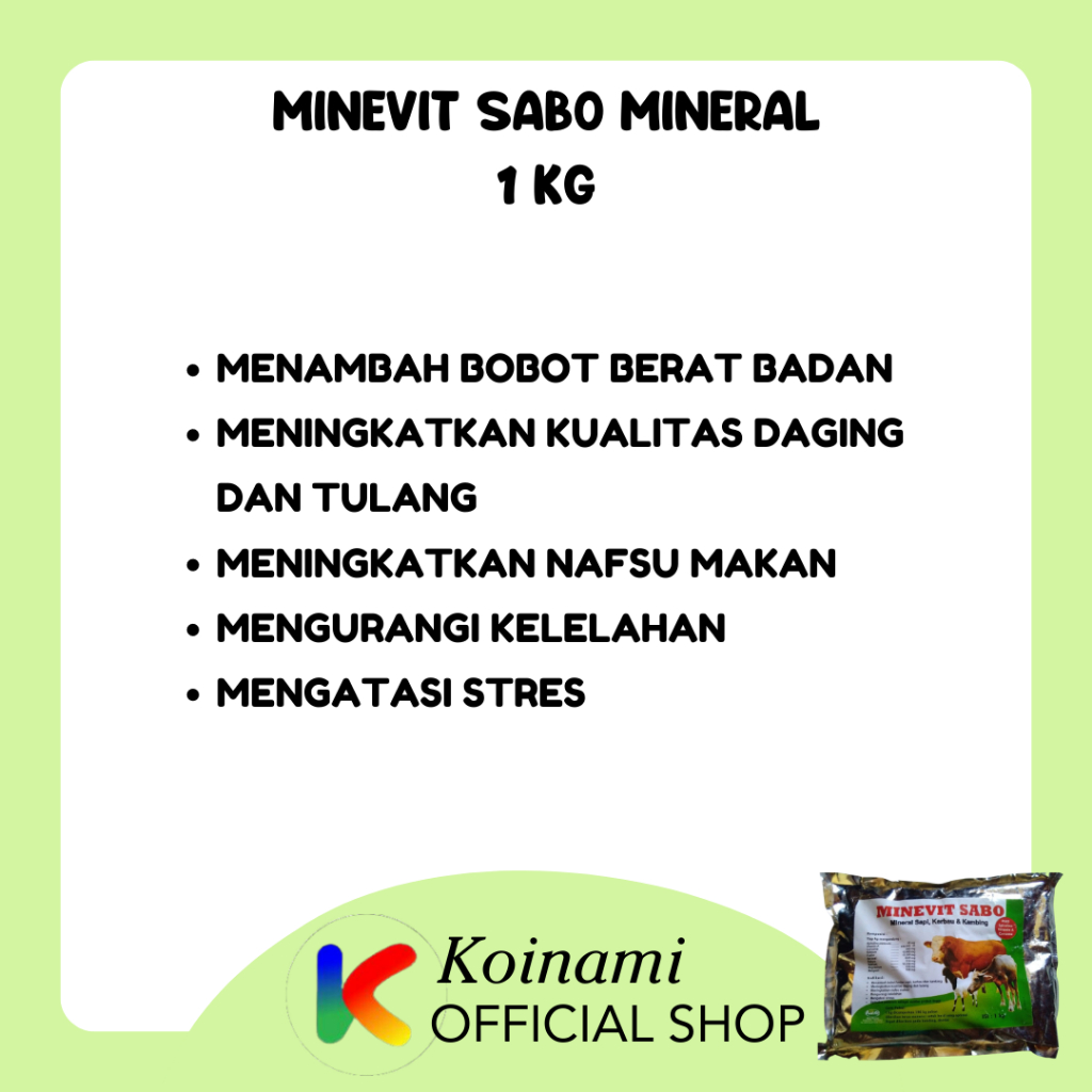MINEVIT SABO 1 KG EXP 12.2029 INDIKASI : -MENAMBAH BOBOT BERAT BADAN -MENINGKATKAN KUALITAS DAGING DAN TULANG -MENINGKATKAN NAFSU MAKAN -MENGURANGI KELELAHAN -MENGATASI STRES