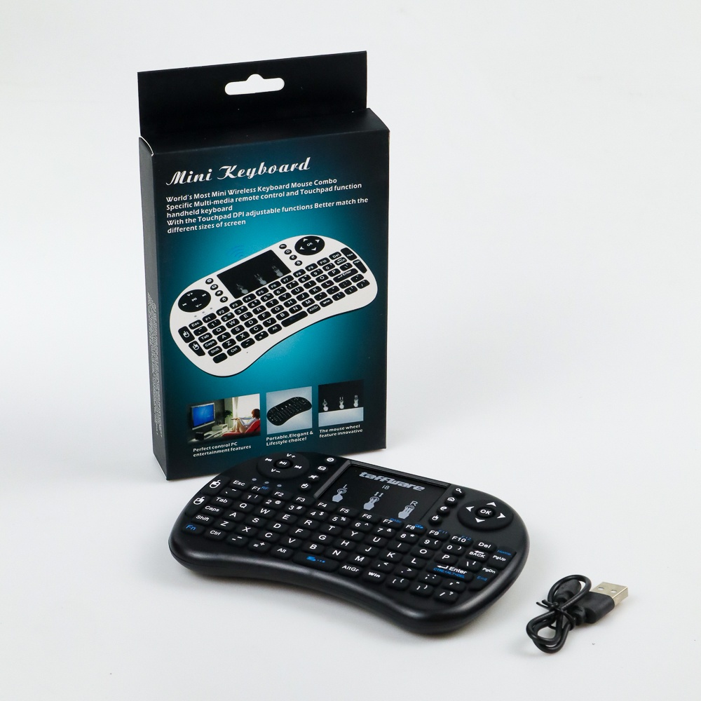 1 x Taffware Mini Keyboard Wireless 2.4GHz dengan Touch Pad & Fungsi Mouse - i8 1 x USB Dongle 1 x Baterai BL-5C 1 x Kabel Charger USB 1 x Panduan Penggunaan