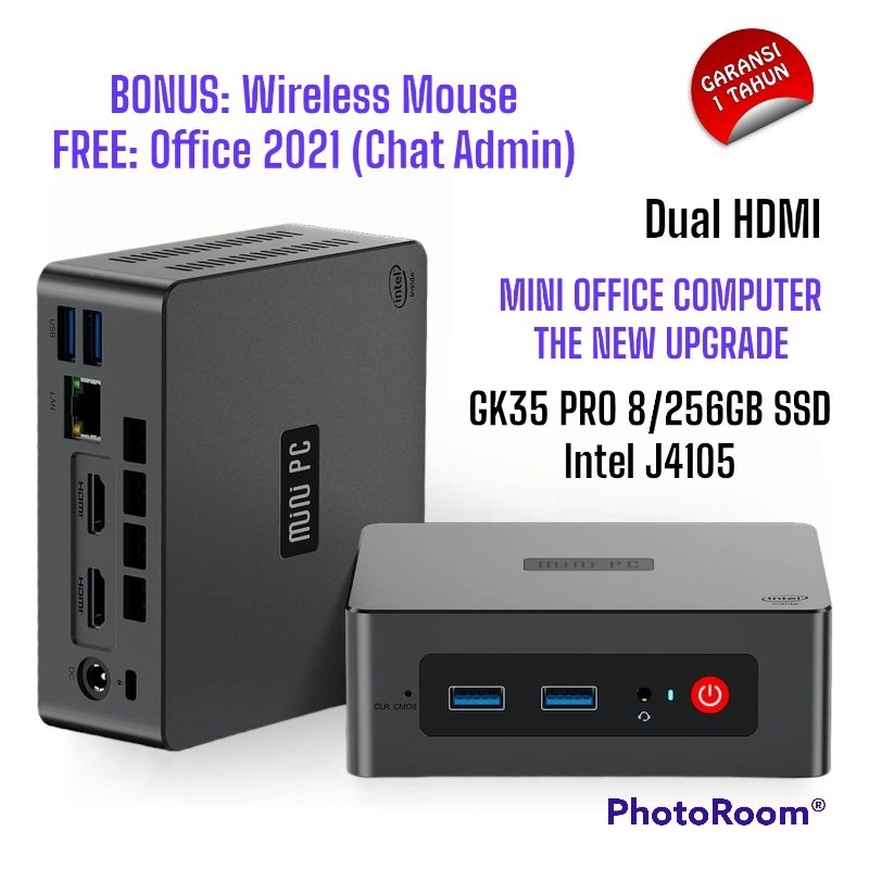 Kelengkapan 1x Unit MiniPC GK35 PRO 1x HDMI Cable 80CM 1x Adapter EU 12V/2A 1x Bracket + Baut (include) 1x Manuall 1x Kartu Garansi Service Internasional