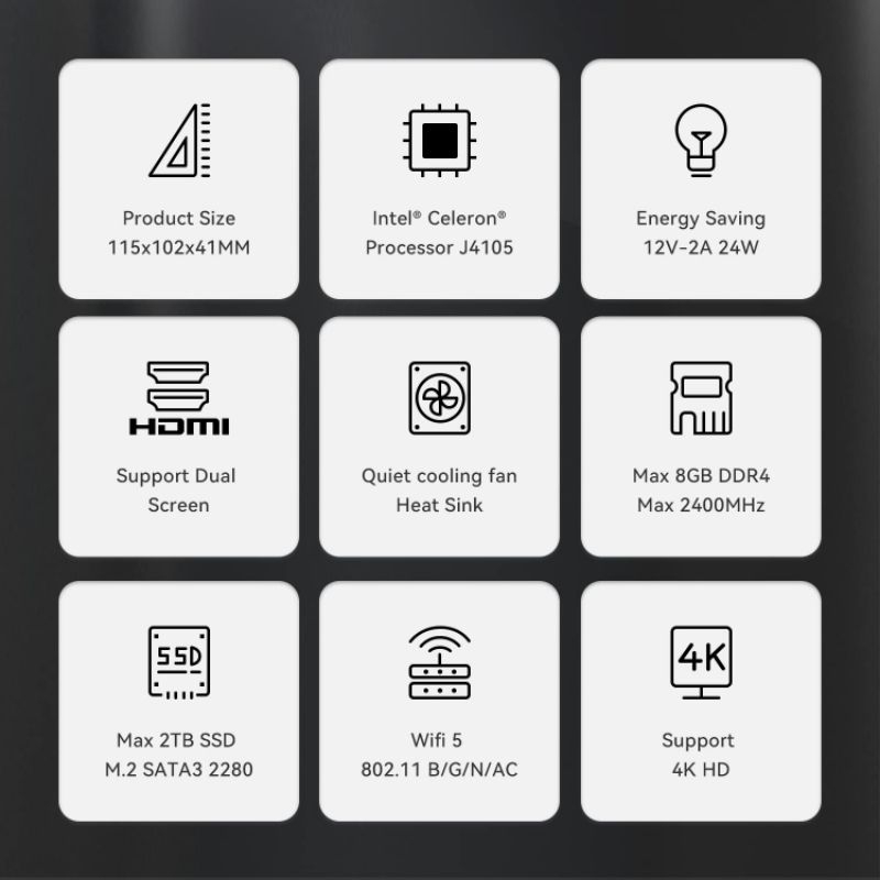 Brand: Beelink Model: GK35 PRO Release Date July 2022 Type: Mini PC System: Windows 10 Pro 64Bit Core: Quad Core Gemini Lake J4105 Clock 1.5 GHz Up to 2.5 Ghz 4 core 4 threads Cache 4M GPU: Intel® HD Graphics 600 RAM: 8GB DDR4 Sodim 2400Mhz Internal Storage : 128 GB SSD M.2 SATA3 2280 WiFi : 2.4 Ghz b/g/n/ac Bluetooth 4.0 Expansion Slot : 1x Slot Sata 2.5 (Maximum HDD/SSD Capacity: 1 TB) Cooling System : Heatsink + Fan
