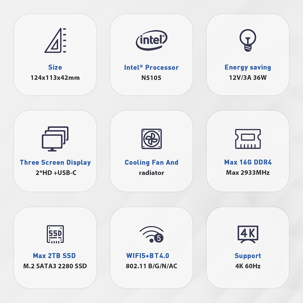 Brand: Beelink Model: U59 Pro Type: Mini PC System: Windows 11 Pro 21H2 64Bit Core: Quad Core Jasper Lake N5105 Clock 2.0 GHz Up to 2.9Ghz GPU: 16EU Intel Graphics RAM: 16GB DDR4 @2666mhz Internal Storage : 500GB SSD M.2 SATA3 SSD 2280 Expansion Slot : 1x Slot Sata 2.5 (Maximum HDD/SSD Capacity: 2TB) 2 x Slot Sodim DDR4 ( 1 slot installed) Cooling System : Heatsink + Fan