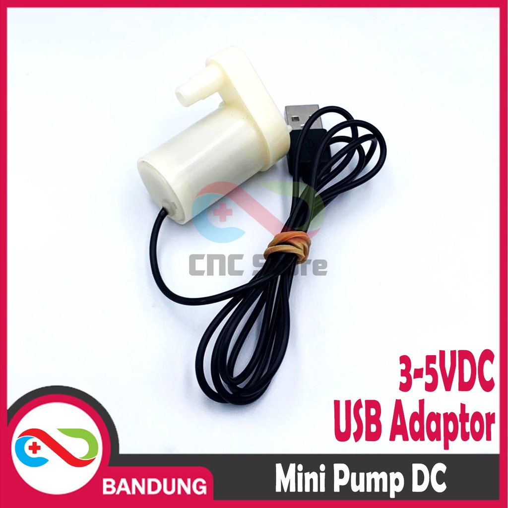 Spesifikasi: ==================== - DC 3-5volt - Arus 130-220 mA - Kemampuan 240L/jam - Dapat menaikkan air s/d 40 cm - Besar pipa output 7.5 mm. - Soket power USB. - Bahan plastik. - Untuk direndam. - Pompa tipe brushed. - Tegangan Kerja 3-6V DC. - Panjang kabel sekitar ~93cm. - Aliran maksimum 2 liter/menit. - Daya dorong maksimum : 1 m. - Diameter nepel: 7mm - Ukuran 24mm x 45mm x 33mm. - Power supply bisa baterai, power bank, charger smartphone, dll.