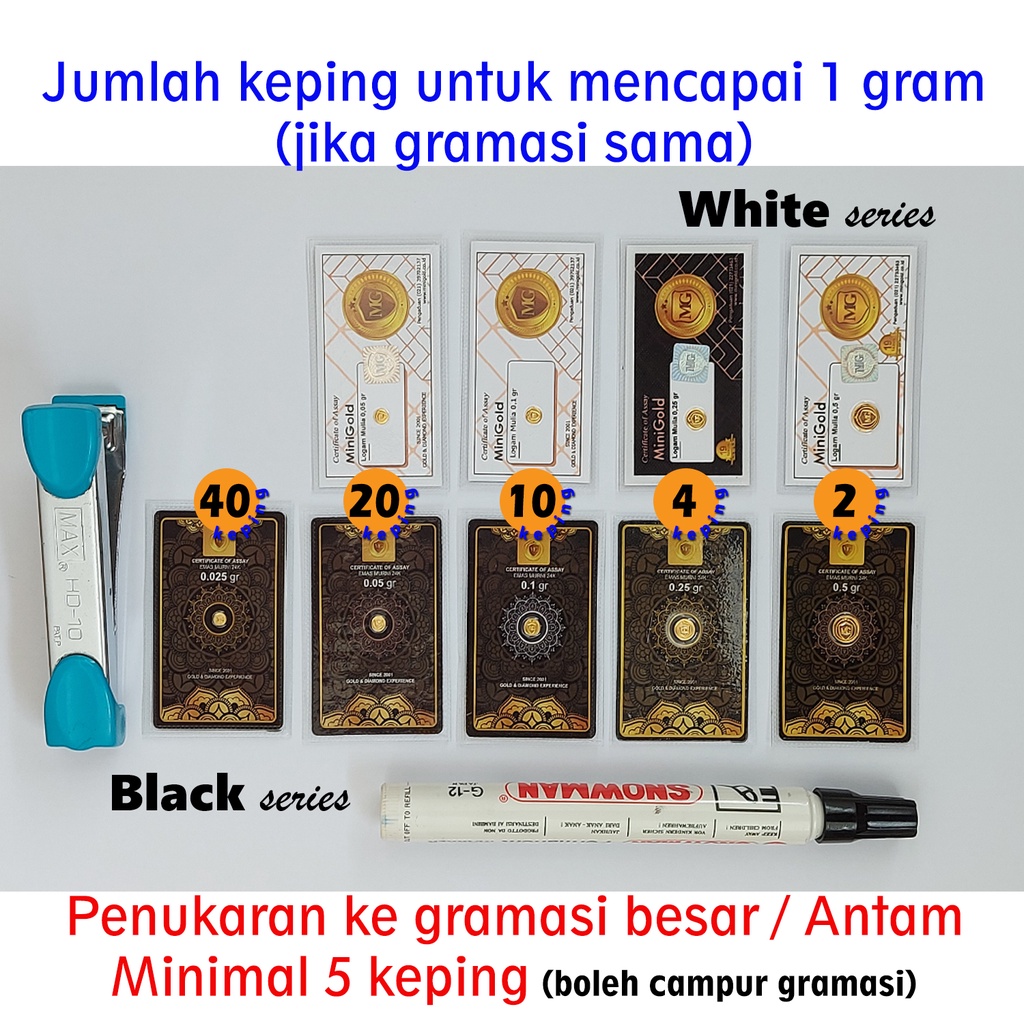 Cocok sebagai hadiah kepada yang diistimewakan sesuai dengan pilihan model momen bahagia. Fine Gold 99,9%. Asli Produk MiniGold (PT SDGM). Sertifikasi Emas melekat pada kemasan. Sertifikasi MiniGold dari SUCOFINDO dan G-Lab Pegadaian. Bisa digadaikan di PEGADAIAN dan dijual di TOKO EMAS (S&K berlaku di masing2 tempat). Tukar gramasi besar/Antam atau Buyback (jual kembali) bisa ke kami atau melalui Distributor MG Resmi yang tersebar di kec/kota di Indonesia. Mendapatkan 1 Faktur Minigold untuk 1 Pesanan (berapapun keping yg dibeli).