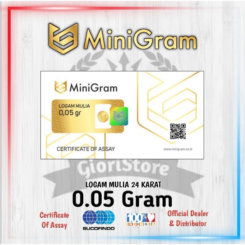 Minigram / Babygold merupakan emas 24 karat bersertifikat resmi & telah di uji di Lab Sucofindo. Minigram / Babygold terdiri dari berbagai macam ukuran mulai dari 0.005 gr, 0.01 gr, 0.02 gr, 0.05 gr dan 0.10 gr.