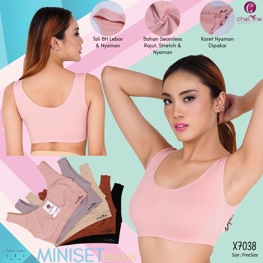 Miniset Chelyne Seamless Rajut Tanpa Busa X7038 Bra Remaja Harian. Miniset untuk anak remaja dan dewasa, bahan seamless rajut, tanpa busa. Bahan elastis, tidak tipis, sangat nyaman dipakai sehari-hari.