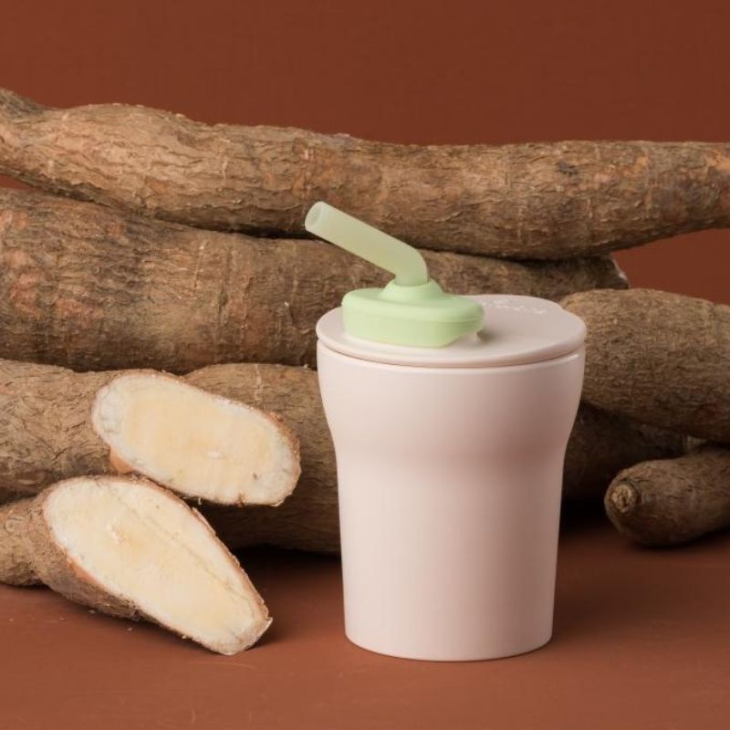 Gelas Miniware 100% plant-based yaitu cassava PLA atau singkong yang dapat diperbaharui dan diuraikan oleh alam. Sedotan terbuat dari premium food grade silicone yang lembut dan aman untuk anak.