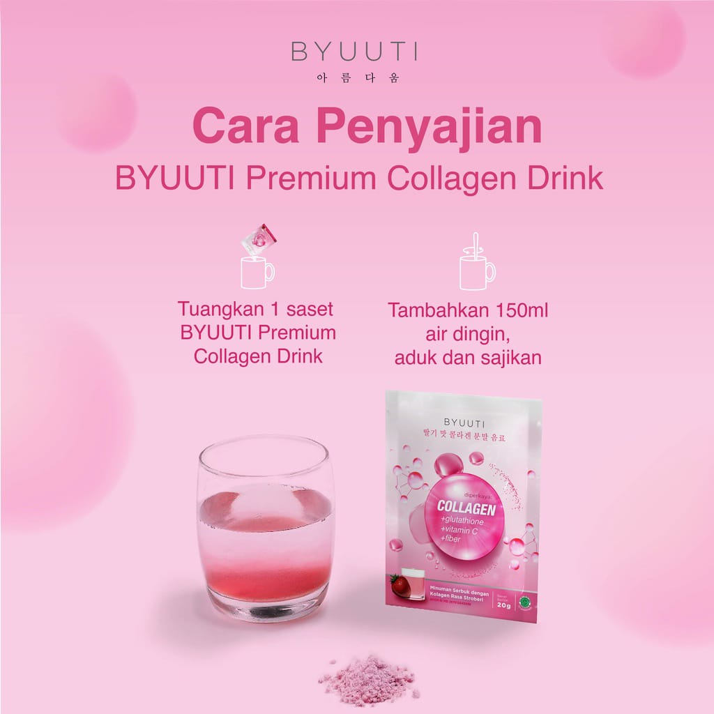 Manfaat BYUUTI Premium Collagen Beauty Drink: ⭐ Menjadikan kulit lebih cerah dan glowing dari dalam ⭐ Menjadikan kulit mulus sempurna ⭐ Menjadikan kulit terlihat lebih muda ⭐ Menghilangkan jerawat aktif & bekas jerawat ⭐ Memperkuat mempercepat pertumbuhan rambut & kuku