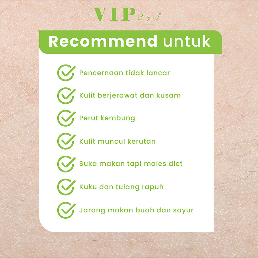 Cocok untuk kamu yang punya masalah: 1. Pencernaan tidak lancar 2. Kulit berjerawat dan kusam 3. Perut kembung 4. Kulit muncul kerutan 5. Suka makan tapi males diet 6. Kuku dan tulang rapuh 7. Jarang makan buah dan sayur