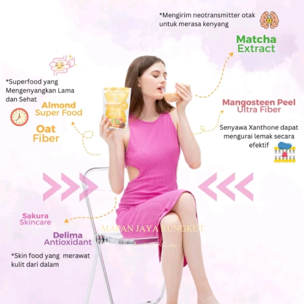 Dilengkapi juga dengan ekstrak sakura🌸 untuk kulit sehat, delima❣️ sebagai antioksidan, dan bubuk teh hijau 🍵 yang bersumber dari studi dapat membantu menurunkan nafsu makan💚.